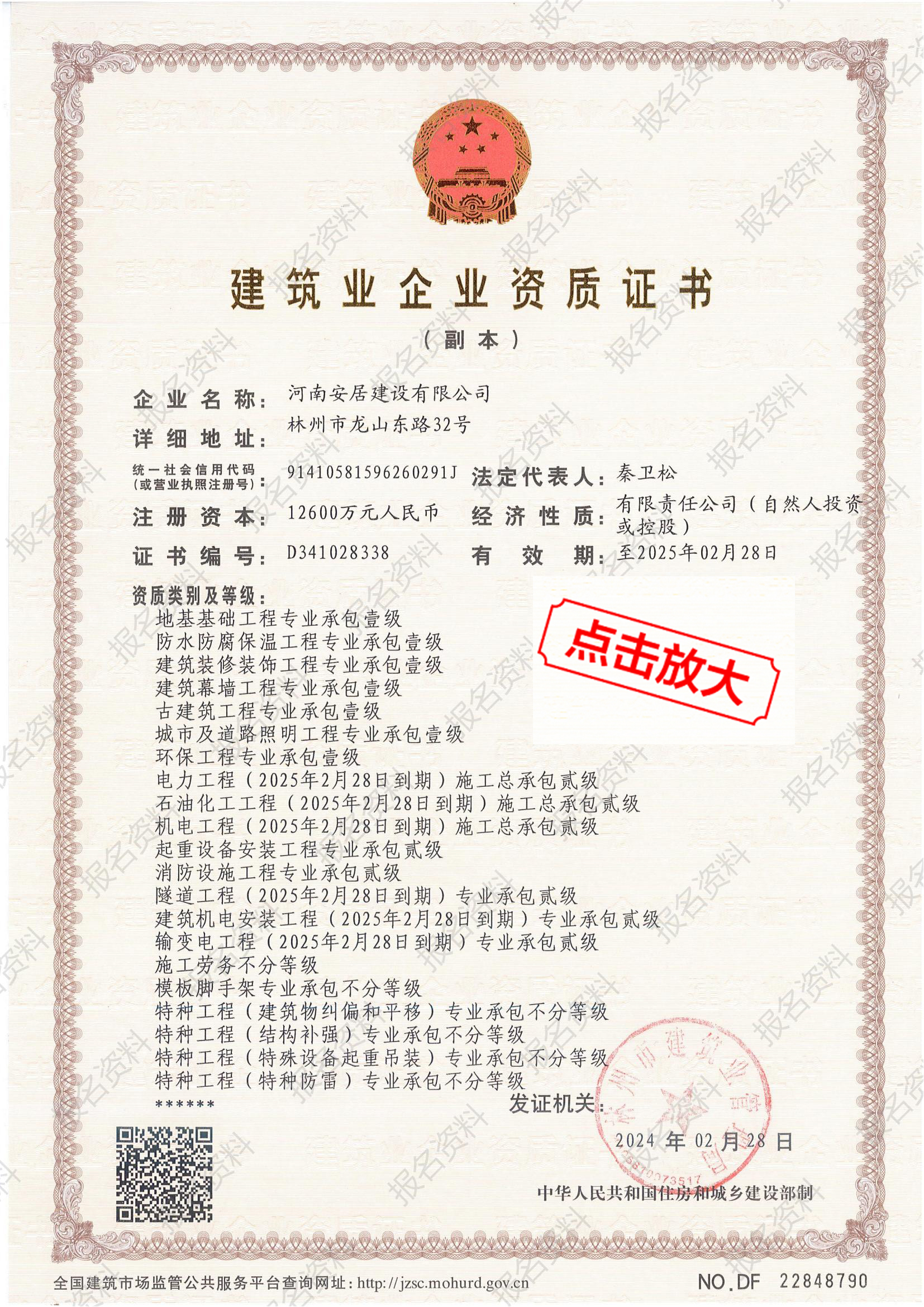 滔滔黃河哺育了中華民族拼搏向上的奮斗精神,巍巍太行造就了中原兒女的紅旗渠精神。百萬林州人下太行,鑄就了中國建筑之鄉(xiāng)響當當的耀眼品牌。河南安居建設有限公司從誕生起血液里就流淌著紅色基因,秉承“安得廣夏千萬間,大庇天下寒士俱歡顏”的擔當精神,用鋼筋混凝土筑起了高樓大廈,也用一流品質、家國情懷打造了安居建設的輝煌成績。公司成立于2012年,注冊資金12600萬元,公司成立至今,擁有建筑,市政施工總承包等十項一級資質;其他二級等資質共二十余項。公司秉承質量第一,服務為主,堅持垂直管理,從不設立分公司等分支機構。